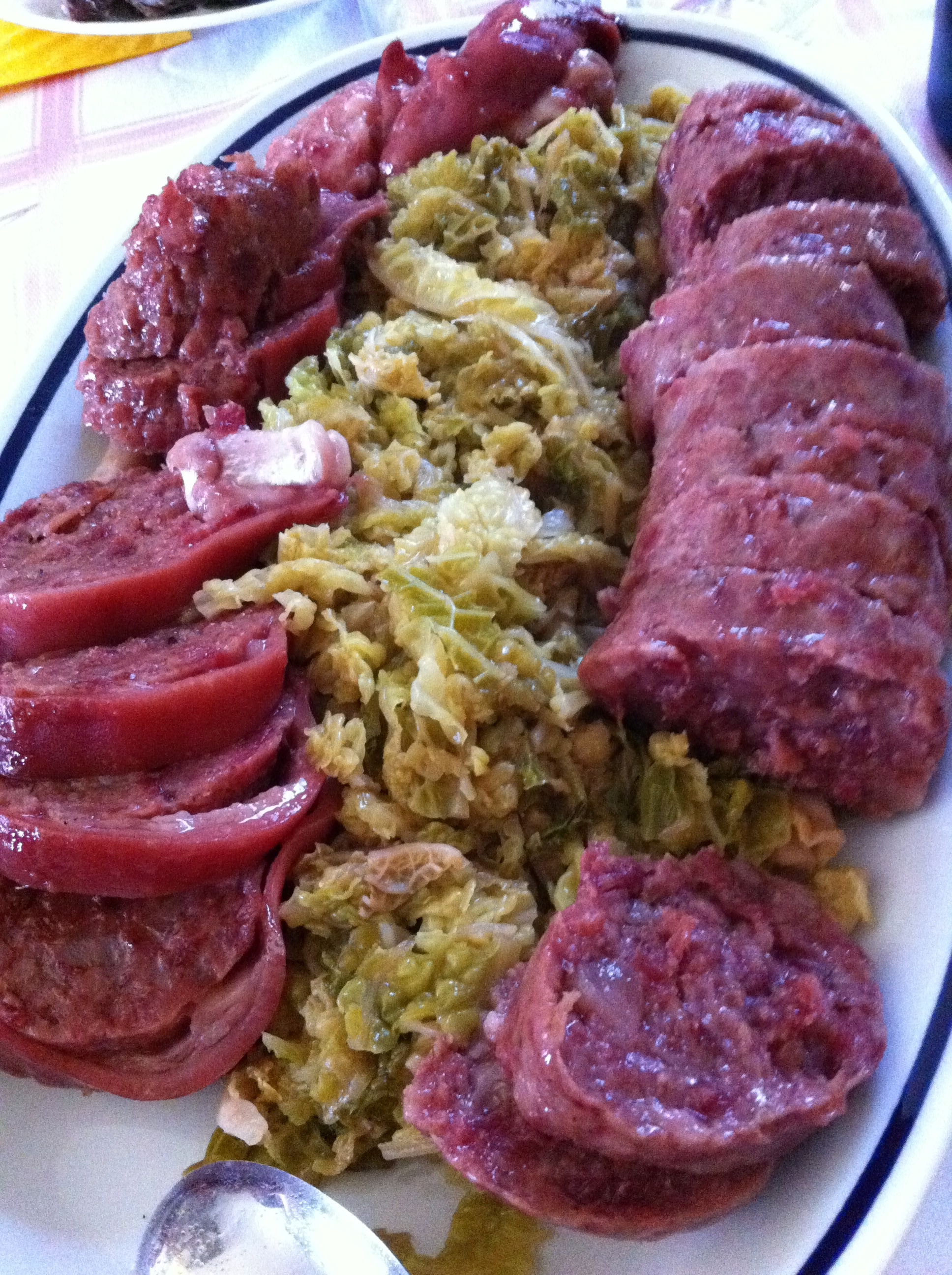 zampone and cotechino, served on a bed of verzo (cabbage) with the traditional lentili (lentils) served on the side this time. Zampone is a pig’s leg, chopped off, boned, and stuffed with a ground mixture of pork, pork rind, and spices. The skin of the leg takes on a gelatinous consistency, which can be avoided by eating cotechino instead, which is a similar thing but only the filling without the leg itself.